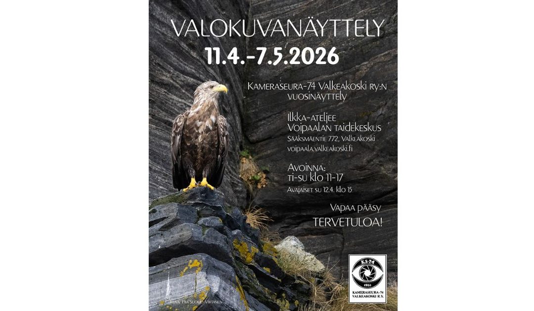 Kameraseura -74 Valkeakoski ry:n vuosinäyttely on avoinna. Näyttelyyn voi tutustua Voipaalan taidekeskuksessa aina 7.5.32026 saakka. Voipaalan taidekeskus on avoinna ti-su kello 11-17.